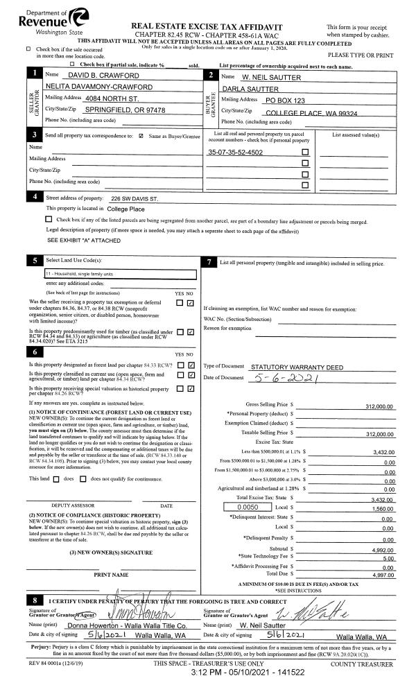 | 1 | 05/10/2021 | SWD | STATUTORY WARRANTY DEED | CRAWFORD DAVID B | SAUTTER W NEIL & DARLA | | | $312,000.00 | 141522 | 2021-05594 |