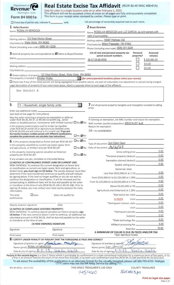 | 1 | 03/02/2023 | QCD | QUIT CLAIM DEED | MENDOZA ROSALVA | MENDOZA ROSALVA & LUZ GARCIA | | | | 145460 | 2023-01060 |
