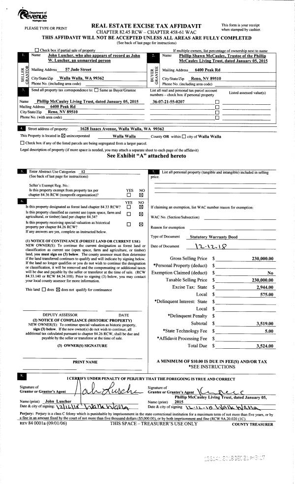 | 2 | 12/21/2018 | SWD | STATUTORY WARRANTY DEED | LUSCHER JOHN | PHILLIP MCCAULEY LVG TRST | | | $230,000.00 | 136141 | 2018-10566 |