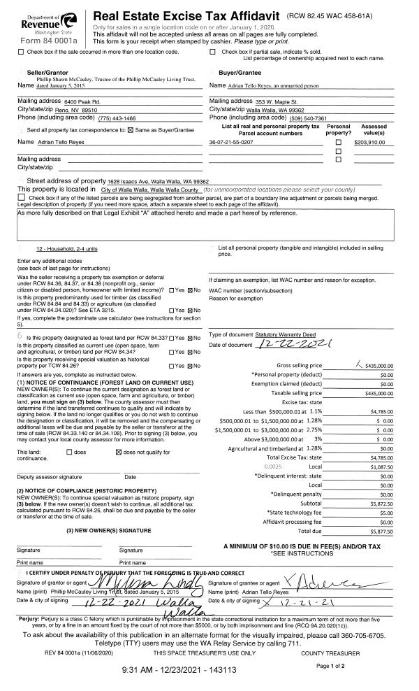 | 1 | 12/23/2021 | SWD | STATUTORY WARRANTY DEED | PHILLIP MCCAULEY LVG TRST | REYES ADRIAN TELLO | | | $435,000.00 | 143113 | 2021-14992 |