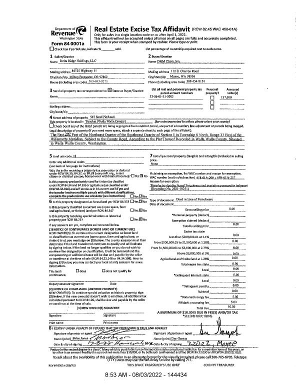 | 2 | 08/03/2022 | DFL | DEED IN LIEU OF FORECLOSURE | DELTA RIDGE HOLDINGS LLC | D & M CHEM INC | | | $0.00 | 144434 | 2022-06501 |