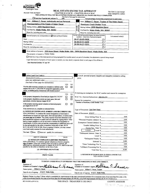 | 2 | 04/12/2017 | QCD | QUIT CLAIM DEED | SAUER WILLIAM C & HELEN A | SAUER HELEN RESIDUARY CREDIT SHELTER TRUST | | | $0.00 | 132193 | 2017-02767 |