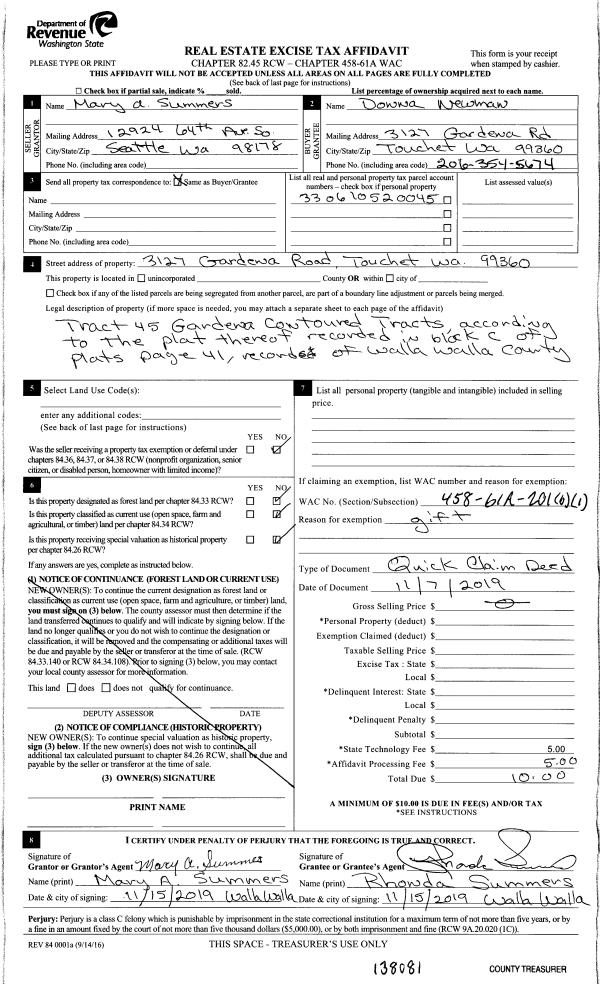 | 4 | 11/07/2019 | QCD | QUIT CLAIM DEED | SUMMERS HOMER L & MARY A | SUMMERS HOMER L ESTATE OF | | | $0.00 | 138081 | 2019-09401 |