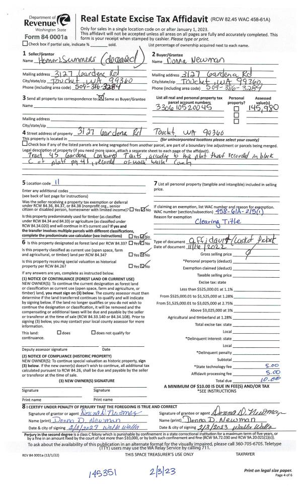 | 3 | 02/03/2023 | LOPA | LACK OF PROBATE AFFIDAVIT | SUMMERS HOMER L ESTATE OF | SUMMERS HOMER L ESTATE OF | | | | 145351 | 2023-00557 |