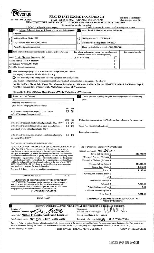 | 2 | 06/01/2017 | SWD | STATUTORY WARRANTY DEED | LOCATI MICHAEL F | HAYDEN DEREK R | | | $220,000.00 | 132522 | 2017-04197 |