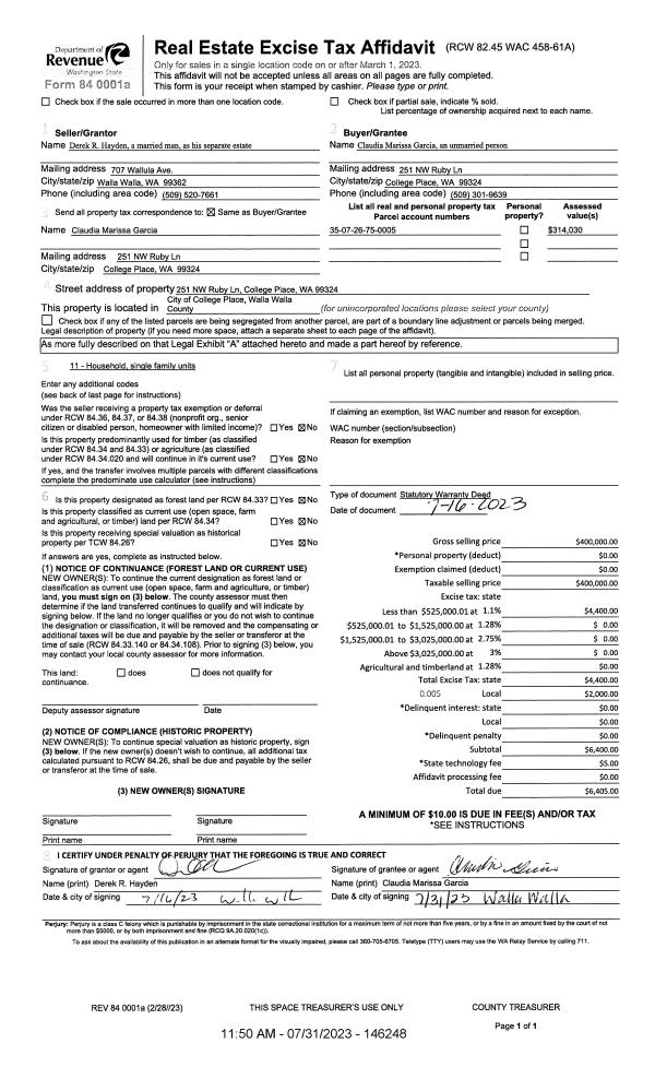 | 1 | 07/31/2023 | SWD | STATUTORY WARRANTY DEED | HAYDEN DEREK R | GARCIA CLAUDIA MARISSA | | | $400,000.00 | 146248 | 2023-04343 |