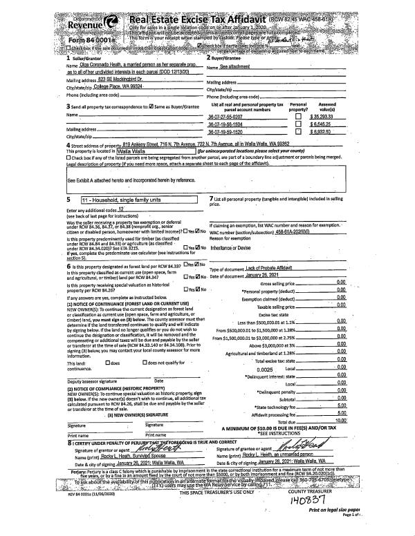 | 2 | 01/26/2021 | LOPA | LACK OF PROBATE AFFIDAVIT | HEATH OLGA CORONADO ESTATE | HEATH DANIEL | | | $0.00 | 140837 | 2021-01224 |