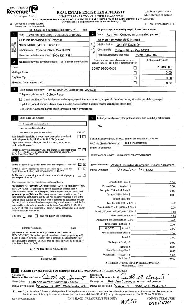 | 1 | 12/11/2020 | COMMUNITY | COMMUNITY PROPERTY AGREEMENT | LONG WILLIAM R & RUTH CORROW | CORROW RUTH ANN | | | | 140537 | 2020-13164 |