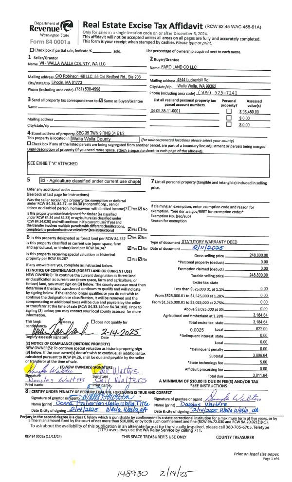 | 1 | 02/14/2025 | SWD | STATUTORY WARRANTY DEED | WI WALLA WALLA COUNTY WA LLC | FARO LAND CO LLC | | | $248,800.00 | 148930 | 2025-00798 |