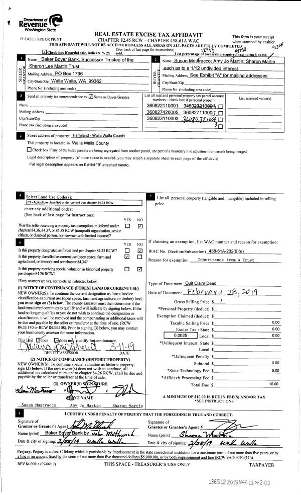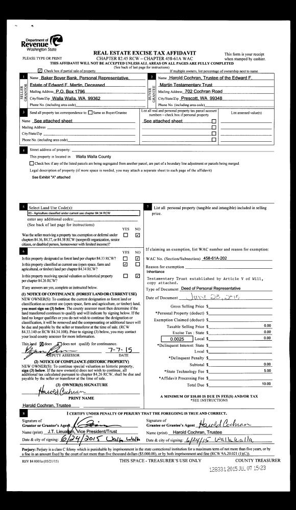 | 1 | 06/24/2015 | DPR | DEED OF PERSONAL REPRESENTATIVE | MARTIN EDWARD F ESTATE | MARTIN EDWARD F TESTAMENTARY TRUST | 5 PARCELS | | $0.00 | 128331 | 2015-05810 |