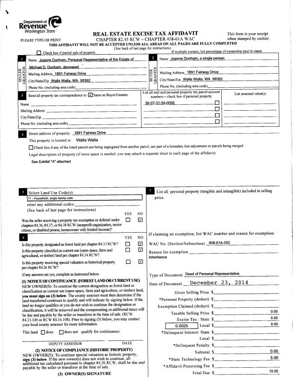 | 1 | 12/23/2014 | DPR | DEED OF PERSONAL REPRESENTATIVE | DUNHAM MICHAEL D & JOANNE | DUNHAM JOANNE | | | $0.00 | 127222 | 2015-00091 |
