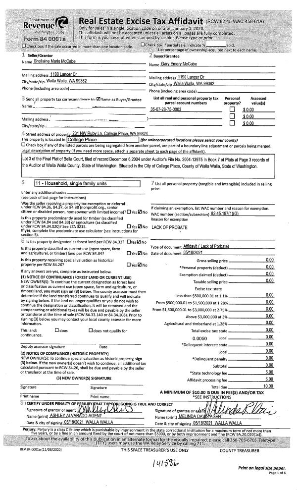 | 3 | 05/20/2021 | LOPA | LACK OF PROBATE AFFIDAVIT | MC CABE GARY & SHELLAINE | MCCABE GARY EMERY ESTATE OF | | | $0.00 | 141586 | 2021-06091 |
