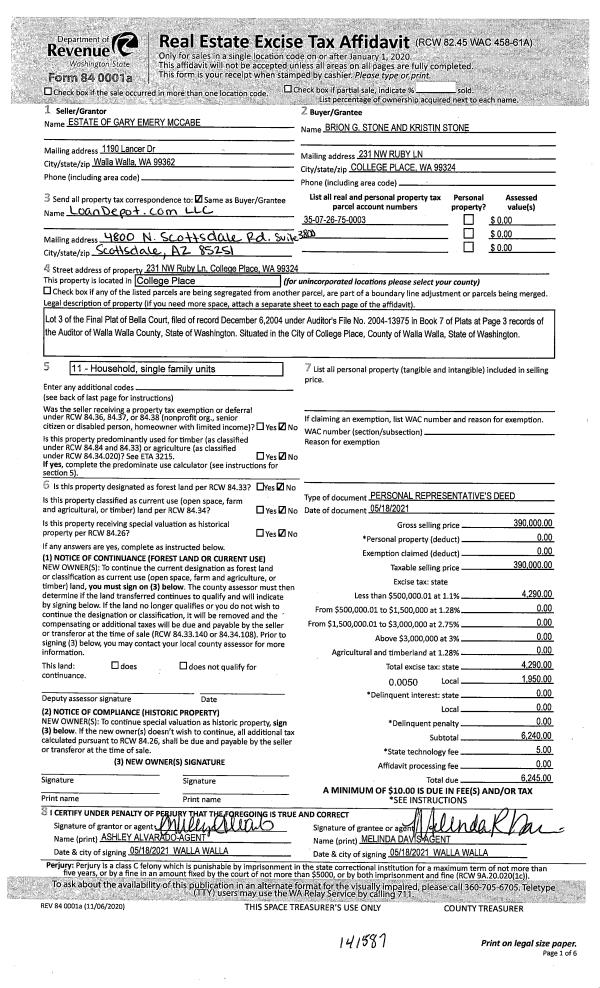 | 2 | 05/20/2021 | DPR | DEED OF PERSONAL REPRESENTATIVE | MCCABE GARY EMERY ESTATE OF | STONE BRION G & KRISTIN | | | $390,000.00 | 141587 | 2021-06092 |