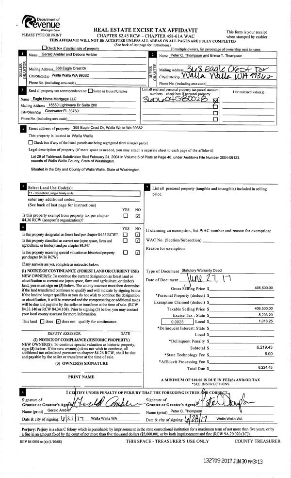 | 1 | 06/30/2017 | SWD | STATUTORY WARRANTY DEED | AMBLER GERALD & DEBORA R | THOMPSON PETER C & BRENDA T | | | $406,500.00 | 132709 | 2017-05049 |