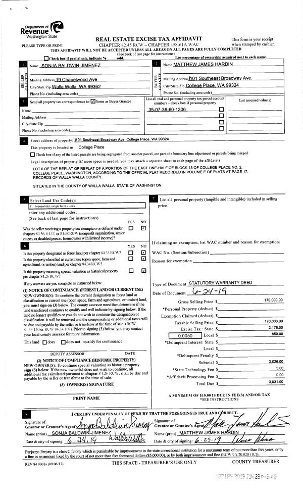 | 3 | 06/28/2019 | SWD | STATUTORY WARRANTY DEED | BALDWIN SONJA | HARDIN MATHEW JAMES | | | $170,000.00 | 137189 | 2019-04656 |