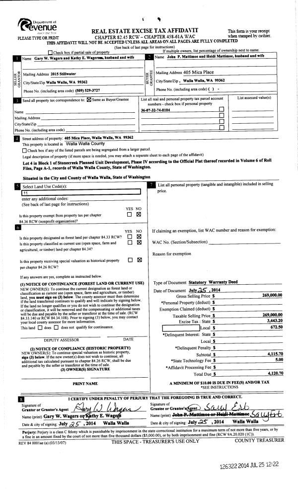 | 1 | 07/25/2014 | SWD | STATUTORY WARRANTY DEED | WAGERS GARY W & KATHY E | MATTIMOE JOHN P & HEIDI | | | $269,000.00 | 126322 | 2014-05254 |