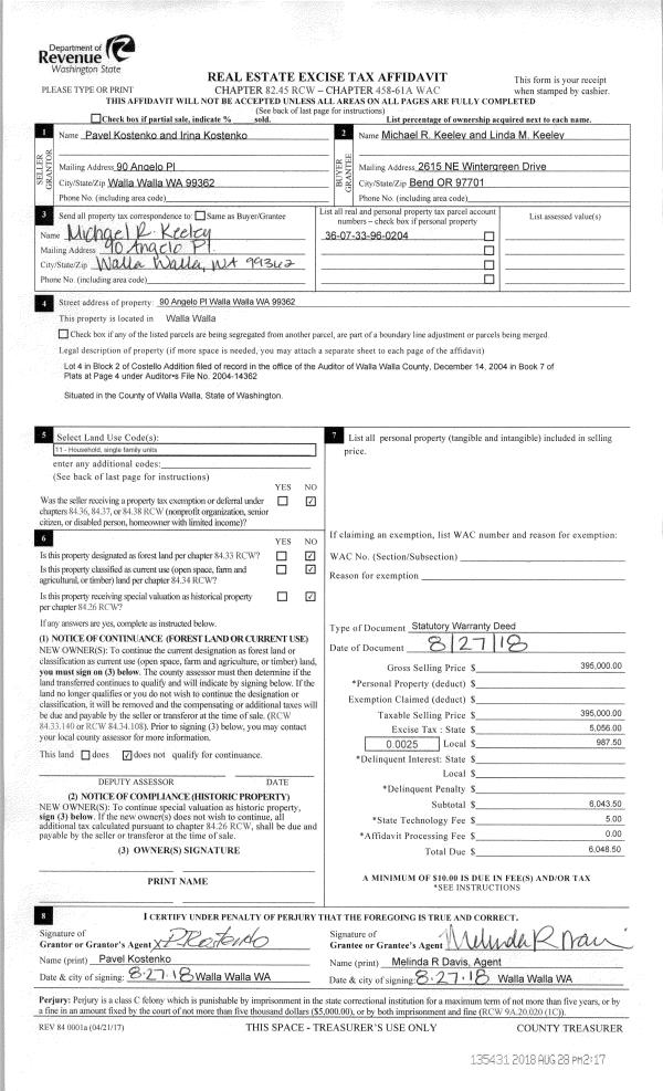 | 1 | 08/28/2018 | SWD | STATUTORY WARRANTY DEED | KOSTENKO PAVEL & IRINA | KEELEY MICHAEL R & LINDA M | | | $395,000.00 | 135431 | 2018-07136 |