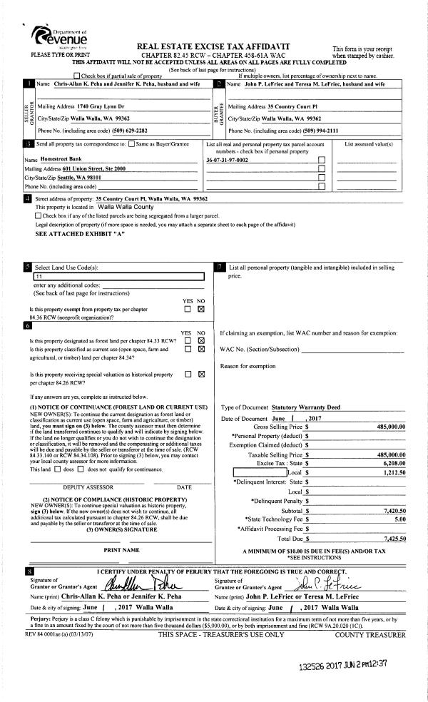 | 1 | 06/02/2017 | SWD | STATUTORY WARRANTY DEED | PEHA CHRIS-ALLAN K & JENNIFER K | LEFRIEC JOHN P & TERESA M | | | $485,000.00 | 132526 | 2017-04224 |