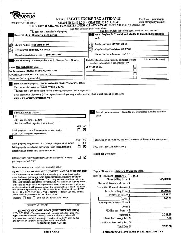 | 2 | 01/22/2015 | SWD | STATUTORY WARRANTY DEED | FLEMMER NICOLE M | CAMPBELL STEPHEN D & MARTHA O | | | $145,000.00 | 127309 | 2015-00496 |