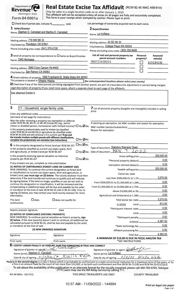 | 1 | 11/09/2022 | SWD | STATUTORY WARRANTY DEED | CAMPBELL STEPHEN D & MARTHA O | HUFFAKER LE | | | $325,000.00 | 144994 | 2022-09036 |