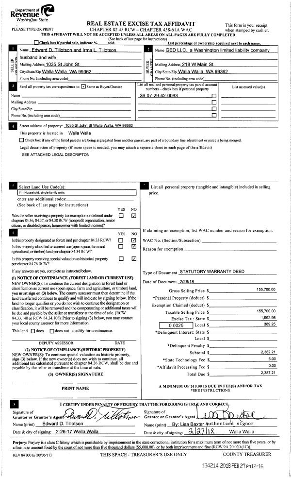 | 2 | 02/27/2018 | SWD | STATUTORY WARRANTY DEED | TILLOTSON EDWARD D & IRMA L | GED LLC | | | $155,700.00 | 134214 | 2018-01575 |