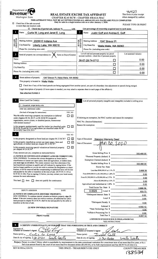 | 1 | 01/31/2020 | SWD | STATUTORY WARRANTY DEED | LONG CURTIS W & JANET E | GOFF JUSTIN & ANDREA E | | | $333,490.00 | 138534 | 2020-00925 |