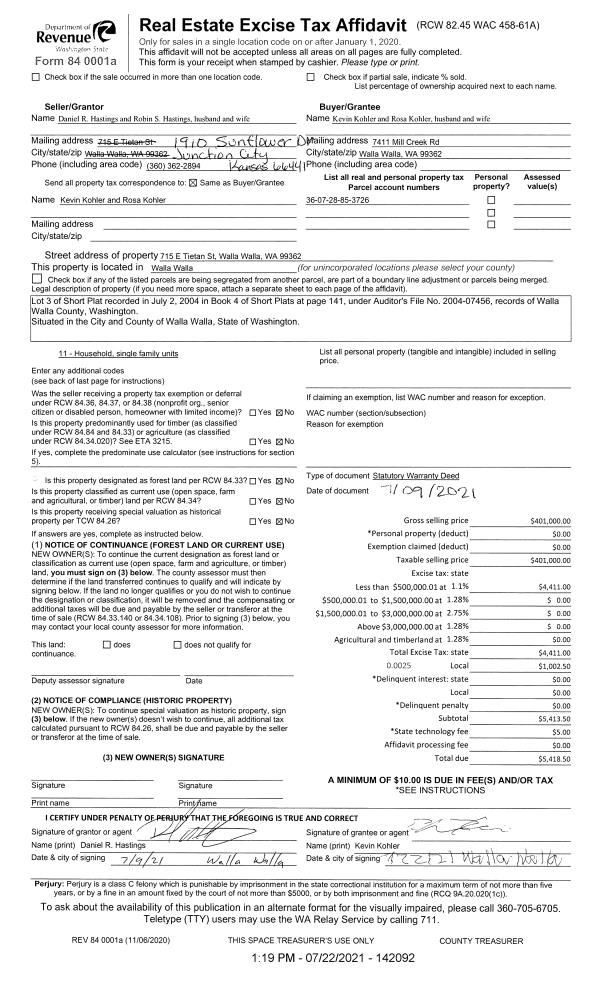 | 1 | 07/22/2021 | SWD | STATUTORY WARRANTY DEED | HASTINGS DANIEL R & ROBIN S | KOHLER KEVIN & ROSA | | | $401,000.00 | 142092 | 2021-08912 |