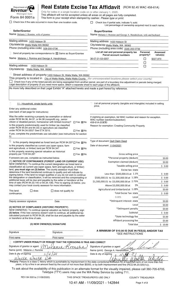 | 1 | 11/09/2021 | QCD | QUIT CLAIM DEED | ROMINE MELANIE J | ROMINE MELANIE J & GEORGE A HENDRICKSON | | | $0.00 | 142844 | 2021-13434 |