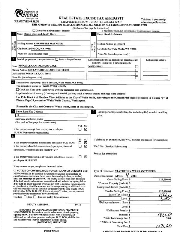 | 4 | 04/09/2014 | SWD | STATUTORY WARRANTY DEED | GLORE DENNIS D & ANN F | JOHNSON SARAH J | | | $122,000.00 | 125698 | 2014-02422 |