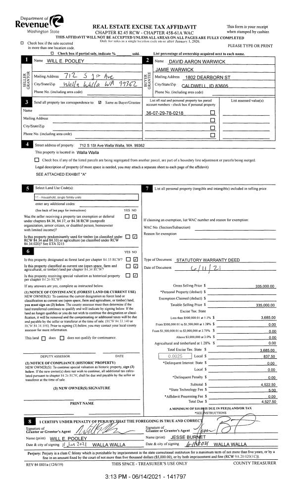 | 3 | 06/14/2021 | SWD | STATUTORY WARRANTY DEED | POOLEY WILL ETHAN | WARWICK DAVID AARON & JAMIE | | | $335,000.00 | 141797 | 2021-07240 |