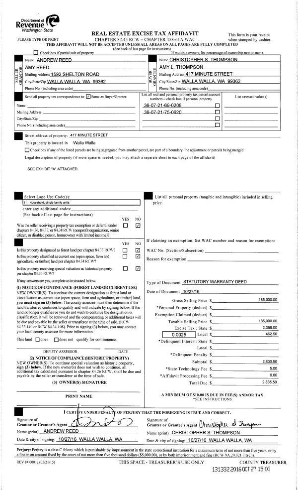 | 1 | 10/27/2016 | SWD | STATUTORY WARRANTY DEED | REED ANDREW L & AMY | THOMPSON CHRISTOPHER S & AMY L | | 2-PARCELS | $185,000.00 | 131332 | 2016-08918 |