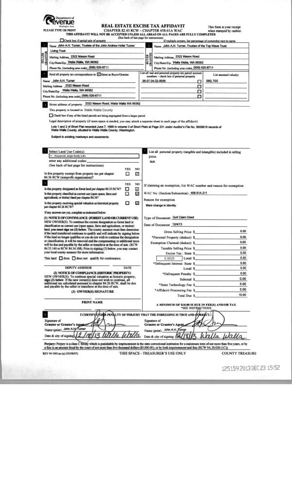 | 2 | 12/30/2013 | QCD | QUIT CLAIM DEED | TURNER JOHN ANDREW HOFER LIVING TRUST | TOP WAVE TRUST | | | | 125159 | 2013-12343 |