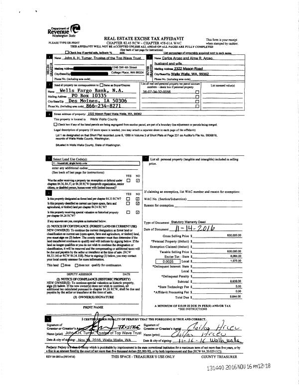 | 1 | 11/16/2016 | SWD | STATUTORY WARRANTY DEED | TOP WAVE TRUST | ARCEO CARLOS & ALMA R | | | $630,000.00 | 131440 | 2016-09475 |