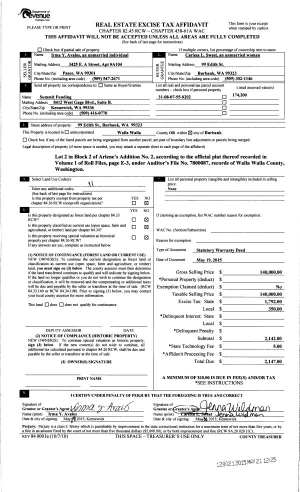 | 1 | 05/21/2015 | SWD | STATUTORY WARRANTY DEED | AVALOS IRMA Y | SWEET CARISSA L | | | $140,000.00 | 128021 | 2015-04311 |