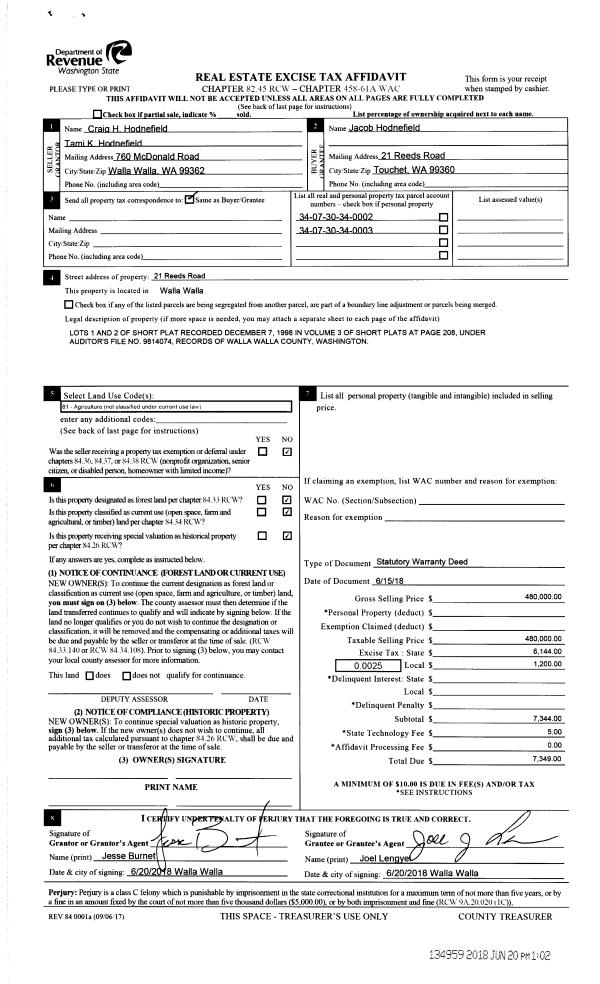 | 1 | 06/20/2018 | SWD | STATUTORY WARRANTY DEED | HODNEFIELD CRAIG & TAMI K | HODNEFIELD JACOB | | 2-PARCELS | $480,000.00 | 134959 | 2018-04950 |