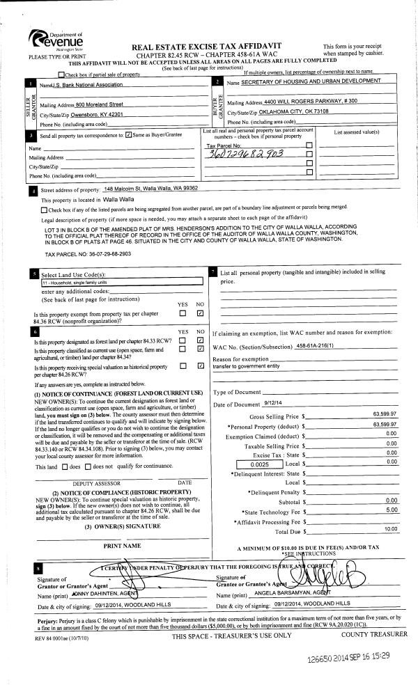 | 3 | 09/12/2014 | SWD | STATUTORY WARRANTY DEED | US BANK NATIONAL ASSOCIATION | SECRETARY OF HOUSING & URBAN DEVELOPMENT | | | $63,599.00 | 126650 | 2014-06779 |