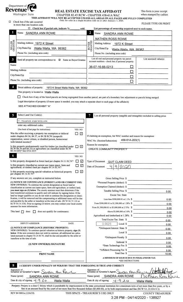 | 1 | 04/09/2020 | QCD | QUIT CLAIM DEED | KOLBABA SANDI A TURNER | ROWE NATHEN ROSS & SANDRA ANN | | | $0.00 | 138927 | 2020-03180 |