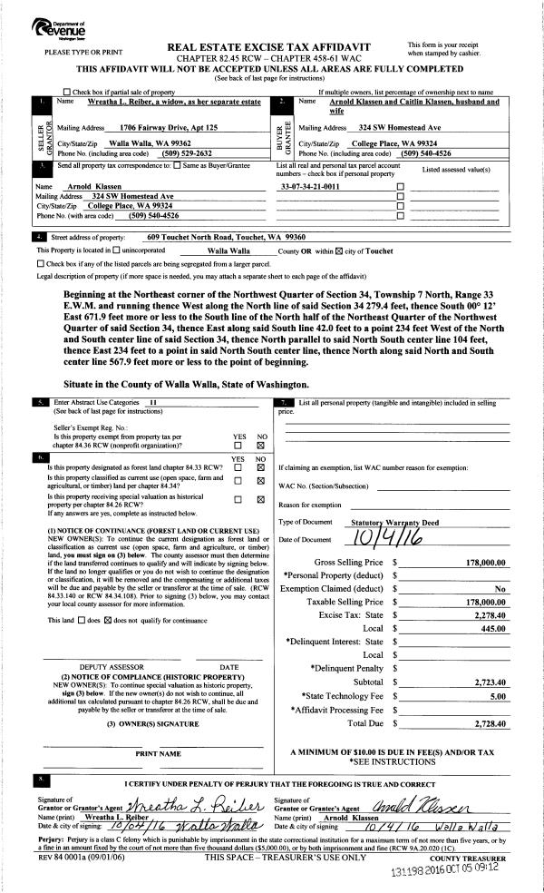 | 1 | 10/05/2016 | SWD | STATUTORY WARRANTY DEED | REIBER WREATHA LU RAE | KLASSEN ARNOLD & CAITLIN | | | $178,000.00 | 131198 | 2016-08203 |