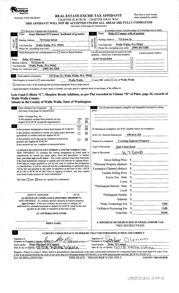 | 1 | 11/13/2018 | QCD | QUIT CLAIM DEED | O'CONNOR SEAN MICHAEL | O'CONNOR DELIA | | | | 135925 | 2018-09355 |