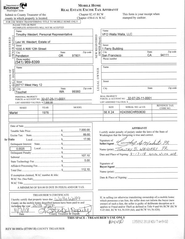 | 2 | 11/07/2018 | MH AFFIDAV | MOBILE HOME AFFIDAVIT | WEIDERT TIMOTHY S | VFO WALLA WALLA LLC | | | $7,000.00 | 135892 | MHAFF-135892 |