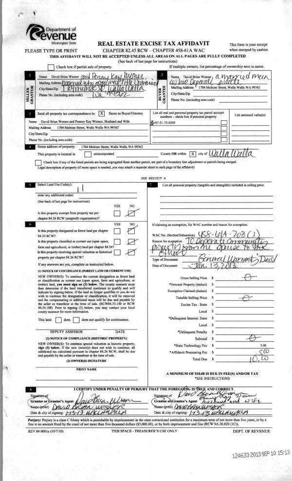 | 1 | 09/10/2013 | WARRANTY D | WARRANTY DEED | WESNER, DAVID B & PENNY K | WESNER, DAVID BRIAN | | | $0.00 | 124633 | 2013-09304 |