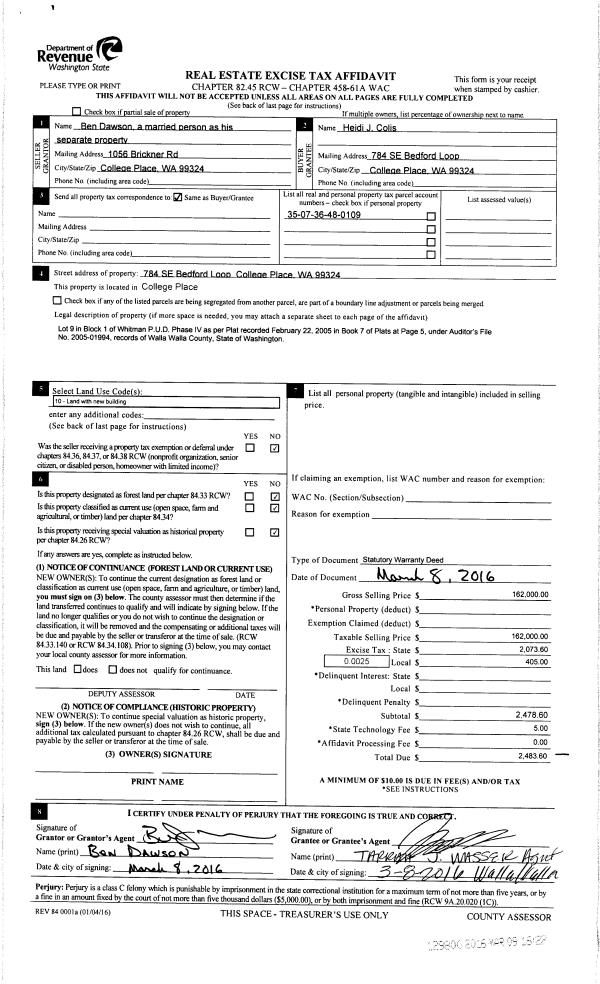 | 1 | 03/09/2016 | SWD | STATUTORY WARRANTY DEED | DAWSON BEN | COLIS HEIDI J | | | $162,000.00 | 129800 | 2016-01826 |