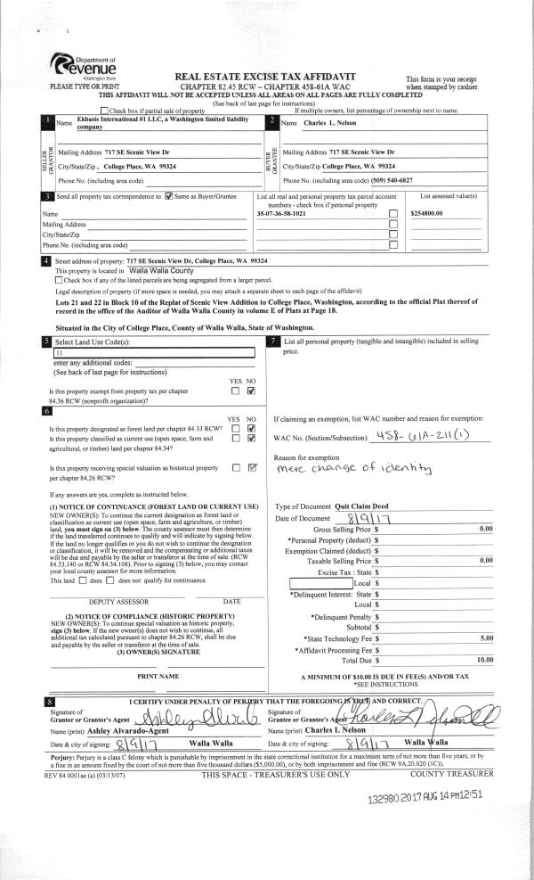 | 3 | 08/09/2017 | QCD | QUIT CLAIM DEED | EKBASIS INTERNATIONAL #1 LLC | NELSON CHARLES L | | | $0.00 | 132980 | 2017-06197 |