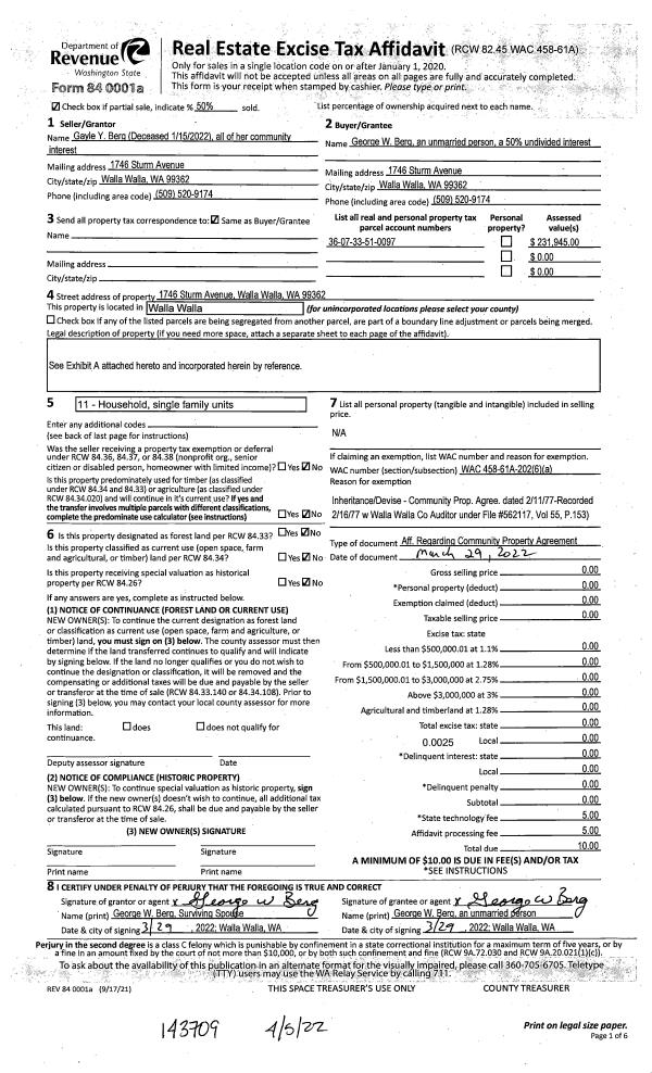 | 1 | 03/29/2022 | COMMUNITY | COMMUNITY PROPERTY AGREEMENT | BERG GEORGE W & GAYLE Y | BERG GEORGE W | | | $0.00 | 143709 | 2022-02841 |