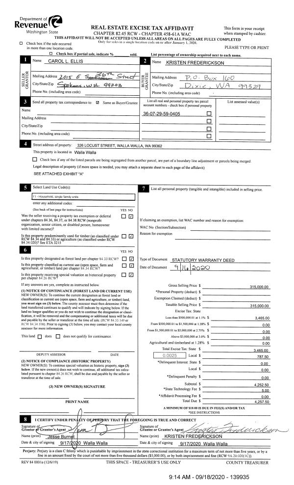| 1 | 09/18/2020 | SWD | STATUTORY WARRANTY DEED | ELLIS CAROL L | FREDERICKSON KRISTEN | | | $315,000.00 | 139935 | 2020-09540 |