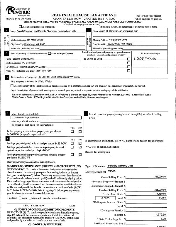 | 3 | 05/18/2015 | SWD | STATUTORY WARRANTY DEED | CHAPMAN DAVID & PAMELA | DONOVAN JUSTIN M | | | $325,000.00 | 128000 | 2015-04216 |