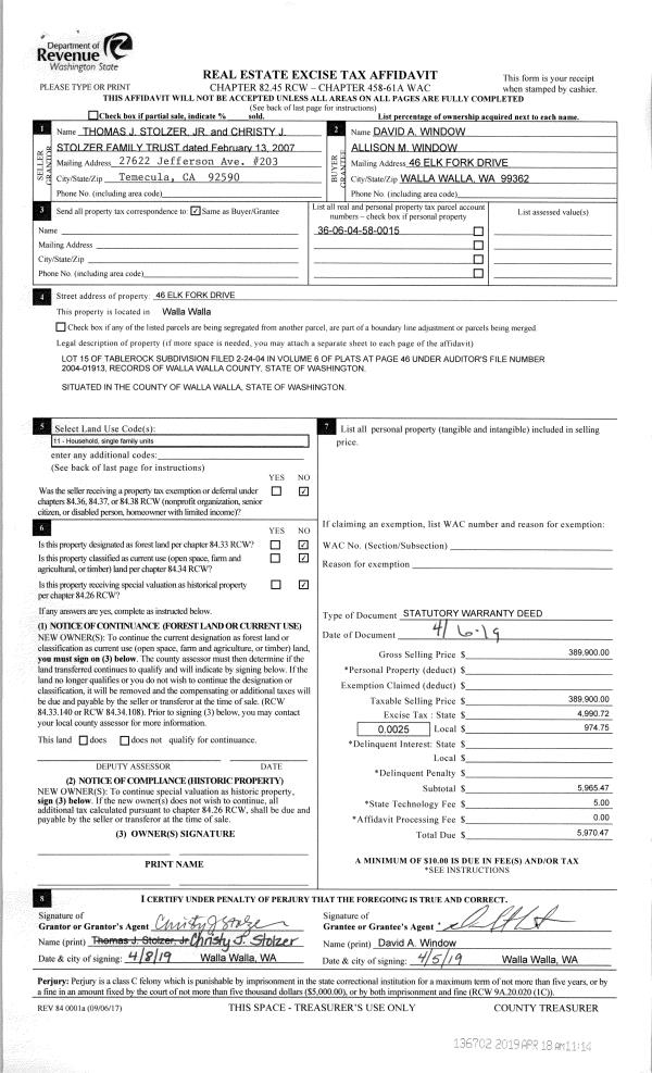 | 1 | 04/18/2019 | SWD | STATUTORY WARRANTY DEED | THOMAS J STOLER JR & CHRISTY J STOLZER FAMILY TRUST | WINDOW DAVID A & ALLISON M | | | $389,900.00 | 136702 | 2019-02457 |