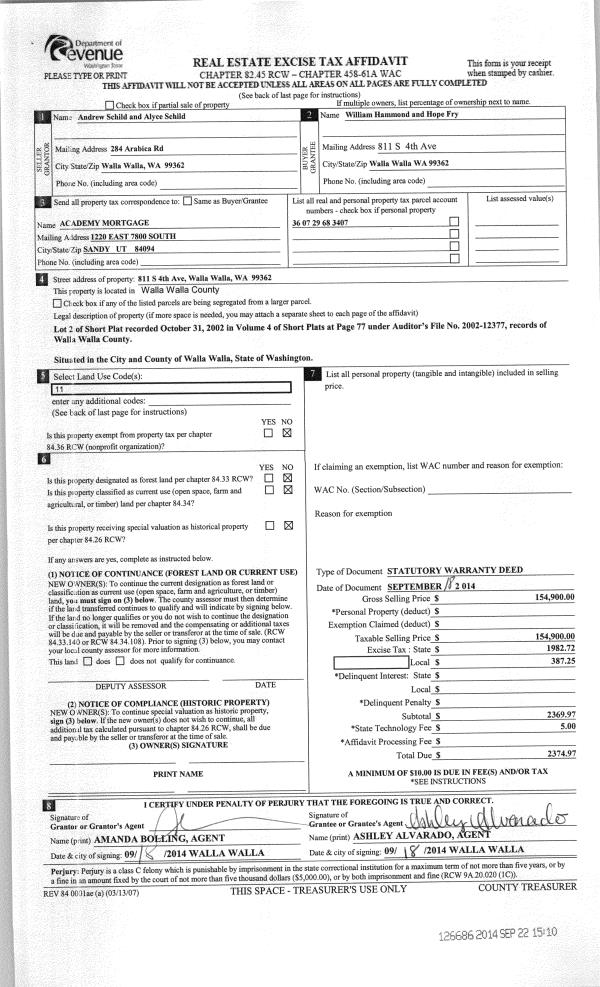 | 3 | 09/18/2014 | SWD | STATUTORY WARRANTY DEED | SCHILD ANDREW & ALYCE | HAMMOND WILLIAM | | | $154,900.00 | 126686 | 2014-06943 |
