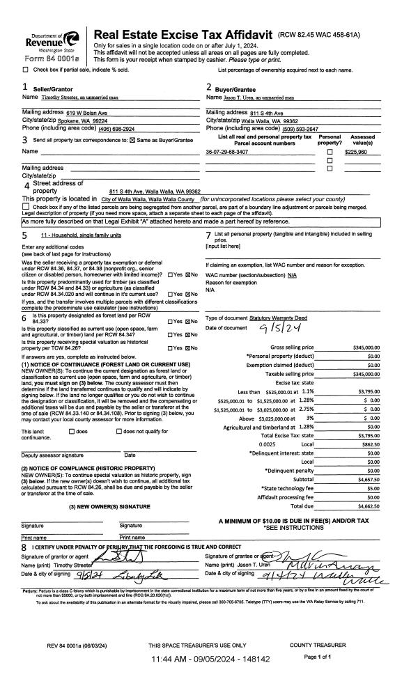 | 1 | 09/05/2024 | SWD | STATUTORY WARRANTY DEED | STREETER TIMOTHY | UREN JASON T | | | $345,000.00 | 148142 | 2024-05014 |