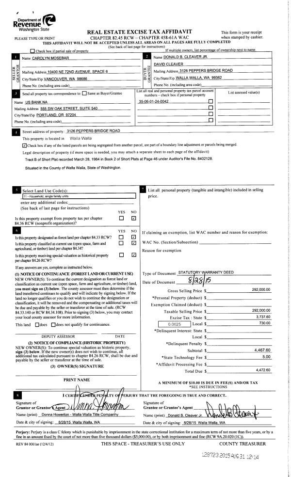 | 2 | 08/31/2015 | SWD | STATUTORY WARRANTY DEED | MOSEBAR CAROLYN | CLEAVER DONALD B JR | | | $292,000.00 | 128723 | 2015-07616 |